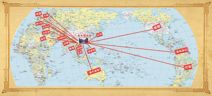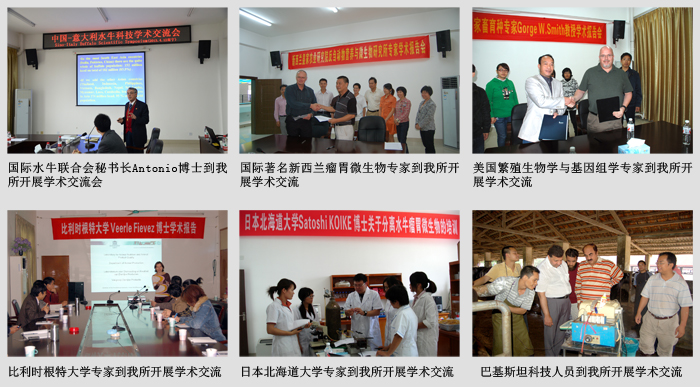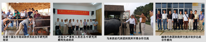 水牛研究所针对各研究领域的技术需求,先后引进外国专家近40名开展技术指导和合作研究;先后派出科技人员前往10多个国家进行学术交流和培训50多人次;先后与意大利、保加利亚、委内瑞拉等10多个国家的同领域专家和机构建立了长期友好的合作关系;每年接待前来参观、洽谈合作、开展学术交流的国际友人和专业人士近百人。