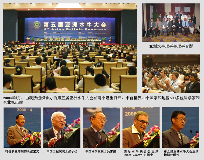 2006年4月,我所成功组织承办了第五届亚洲水牛大会,会议在南宁隆重召开,来自世界20个国家和地区600多位科学家和企业家出席,会议展示了我国开展水牛研发和杂交改良取得的突出成就,宣传了中国,宣传了广西,进一步扩大了我国在国际水牛科技领域的影响,对于进一步加强国际间的交流与合作、促进我区乃至我国水牛业的发展都极其重大的意义,该会议被评为2006年度中国畜牧业十大新闻事件。