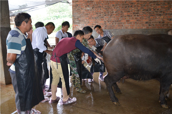 6月1日,来自崇左市的9位基层牛养殖户接过了由广西水牛研究所所长黄加祥颁发的“牛的人工授精技术培训”结业证书,这已经是水牛所针对崇左地区完成的第四期牛的养殖实用操作技术培训任务。在结业现场,来自天等县的学员黄就龙笑呵呵地说,这已经是他来到水牛所参加的第二次培训了。问到原因,他说,因为去年6月参加培训回去后,十里八乡的养牛户都慕名邀请他去帮助进行牛品种改良和养殖指导,更提出了各种各样五花八门的养牛新问题,所以这次他只能再一次来到水牛所请教专家,把学习到的新本领带回去,好把当地的养殖热情带动得更旺一些。