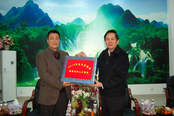 2012年1月16日,在龙年春节即将来临之际,广西壮族自治区人大副主任覃瑞祥在自治区水产畜牧兽医局局长梁雨祥、副局长王强等领导的陪同下莅临我所亲切看望和慰问全国优秀科技工作者、自治区优秀专家杨炳壮研究员,感谢他为水牛事业做出的重大贡献,代表自治区党委和政府向杨炳壮研究员致以新春的祝福。