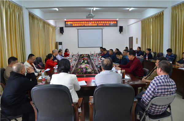 3月12日,由广西水牛研究所方文远高级畜牧师主持的广西科技基地和人才专项《贫困地区特色乳肉兼用水牛的繁育及其高效养殖示范》项目召开项目实施与产业开发交流会,广西富牛牧业有限公司、田东县作登大板村兴民养牛农民专业合作社、广西合浦东园生态农业科技有限公司和广西桂牛水牛乳业股份有限公司等项目合作单位的代表出席会议,并就项目的开展和实施进行交流探讨。