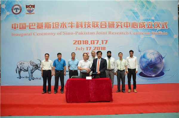 7月17日上午,“中国—巴基斯坦水牛科技联合研究中心”在广西水牛研究所揭牌成立。来自巴基斯坦拉合尔兽医与动物科技大学、国立科技大学信息技术学院、帕图基水牛研究所、旁遮普省水牛养殖协会等巴方水牛科研单位代表,以及广西水牛研究所的全体职工共同见证了中巴两个水牛大国强强联合序幕的拉开。水牛所黄加祥所长和巴基斯坦拉合尔兽医与动物科技大学副校长Pasha教授共同签署了《中国—巴基斯坦水牛科技合作协议》,并与各领导专家共同为联合研究中心进行揭牌。