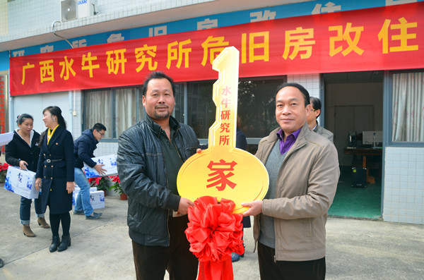在新春佳节即将来临之际,1月22日上午,“广西水牛研究所危旧房改住房工程项目交房仪式”在我所隆重举行,所党总支黄加祥书记代表我所正式将象征交房的“金钥匙”交付给了业主们。全所干部职工自发到场见证这一期盼已久的欢庆时刻,纷纷对项目的顺利交接给予了赞许和祝福。