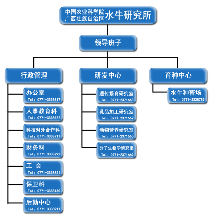 广西水牛研究所下设水牛遗传繁殖、水牛饲料与营养科学、水牛乳制品加工、 分子生物学四大研究室,以及国家级水牛种畜场